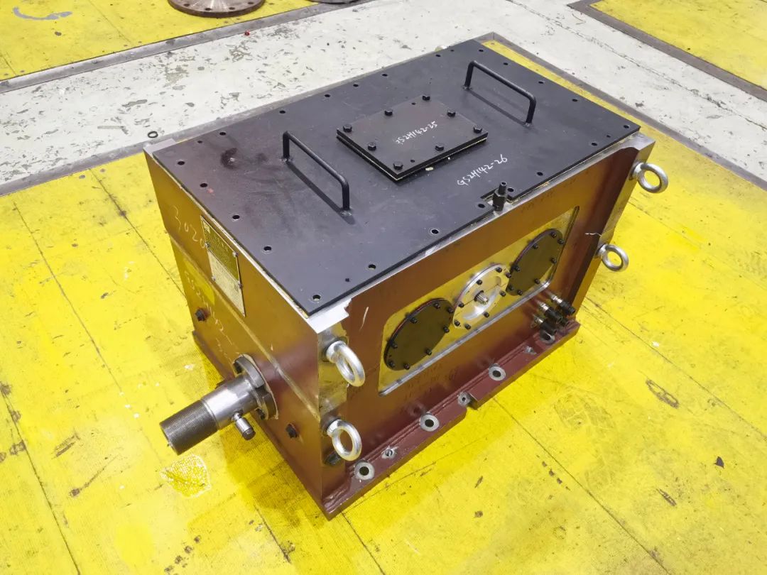 該項目用于燃氣機動力驅(qū)動試驗臺,功率為33MW,輸入轉(zhuǎn)速4500r/min,輸出轉(zhuǎn)速4604 r/min,結(jié)構(gòu)形式為三級水平傳動,其中中間兩級為人字齒惰輪結(jié)構(gòu),齒輪箱總中心高2850mm,采用箱體模態(tài)分析、優(yōu)化軸承、人字齒精密對中等技術(shù),并一次性試車合格,試車各項數(shù)據(jù)均高于API標準。該臺齒輪箱無論是設(shè)計、制造均達到國內(nèi)水平,為燃氣機動力驅(qū)動試驗臺建設(shè)起到了關(guān)鍵作用。